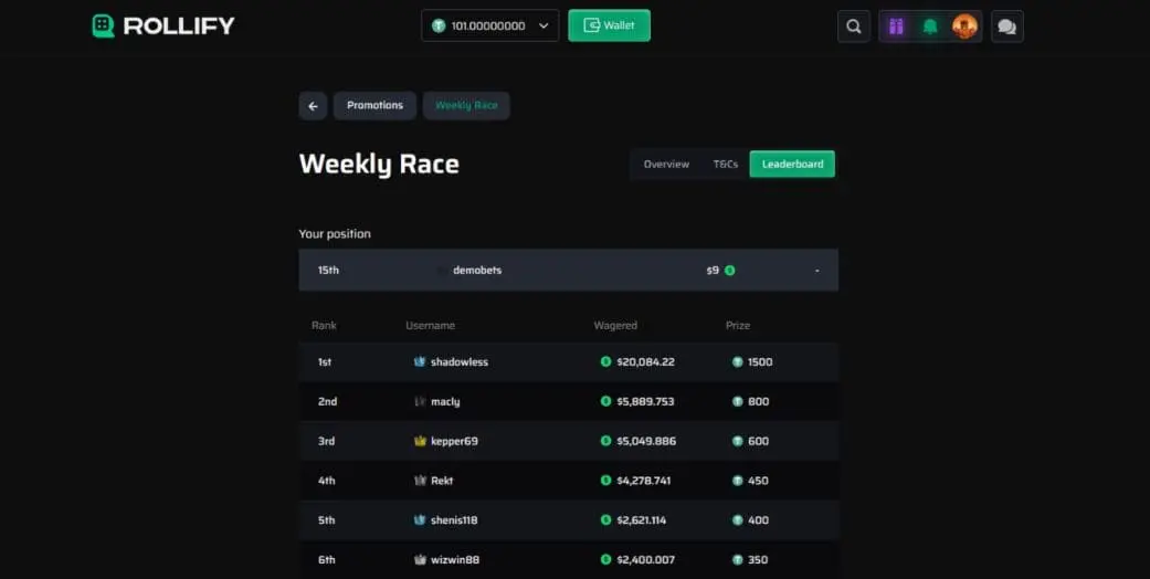 Other than the welcome bonus and loyalty program (I’ll cover that next), the only promotion running at Rollify was a weekly wager race. The first prize was 1,500 USDT.