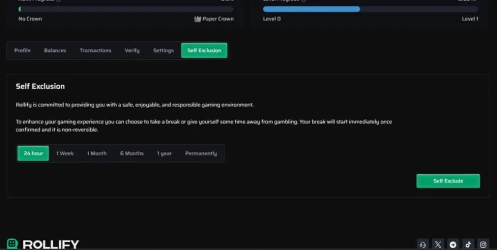 In common with most Anjouan-licensed crypto casinos, Rollbit also falls down when it comes to responsible gambling. Yes, you can easily self-exclude, which is good, but there are no other self-service safer gambling tools.