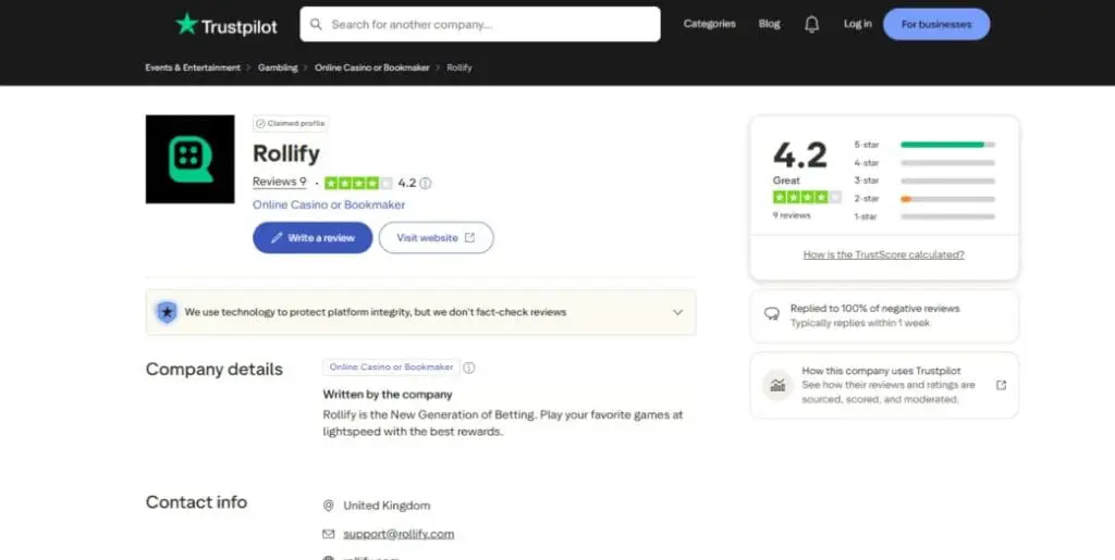 Now we’ve seen what Rollify casino offers, what are other people saying about it? Well, to be honest, it’s too early to tell. Below are a couple of initial ratings from popular review platforms, but this casino really needs more time to accumulate reviews.