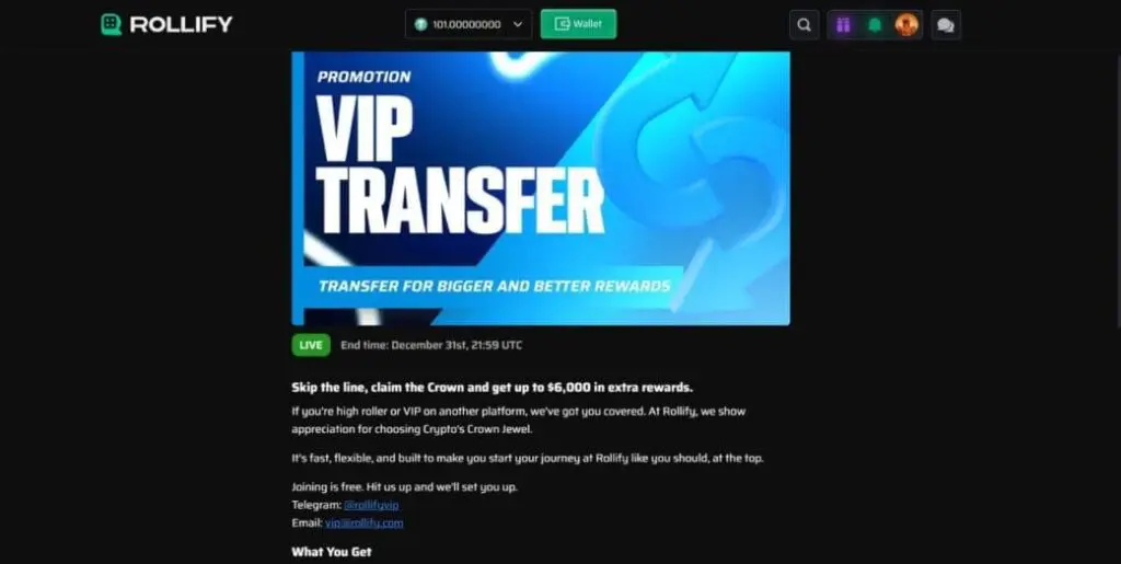Until the end of December 2025, Rollify was also offering a VIP transfer service. If you’re interested in taking advantage of the “Crown Club Shortcut”, you should get in touch via email or Telegram.