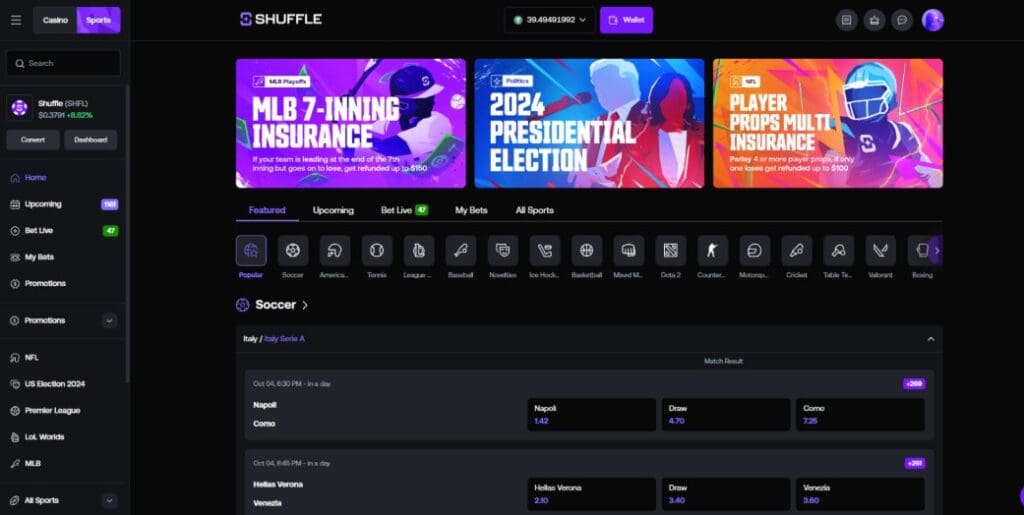 Although this is primarily a review of the Shuffle crypto casino, I will just mention the sportsbook. At first glance, it looks pretty much standard. Most mainstream sports are available, including American football, baseball, basketball, boxing, cricket, golf, ice hockey, MMA, motorsport, rugby union, soccer, and tennis – the notable exception being the lack of horse racing.