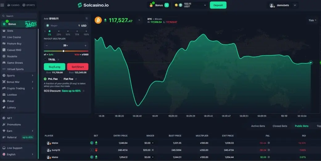 Unusually, Solcasino.io also offers crypto trading. The interface is simple – set your wager and payout multiplier, and Buy/Long or Sell/Short. Both PnL and flat fee trading are offered. However, it’s important to remember that this kind of trading is essentially no different from gambling – so treat it as entertainment and never put more than you can afford to lose on the line.