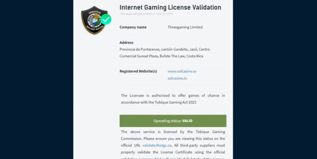 Solcasino.io is operated by Threegaming Limited, based in Costa Rica. It has a license from the Tobique Gaming Commission (Tobique is a First Nation located within New Brunswick, Canada).