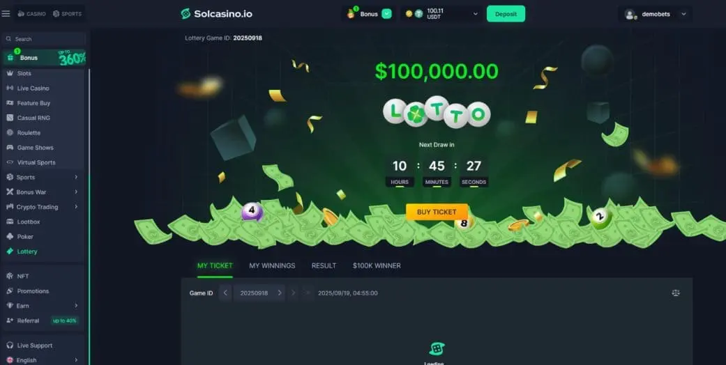Tickets for the Solcasino.io provably fair daily in-house lottery cost $2 each, and you can choose your own numbers. Matching 5 balls plus the bonus ball lands you a US$100,000 jackpot, while matching just the bonus ball gets you $2. If more than one player wins, the prize is shared equally.