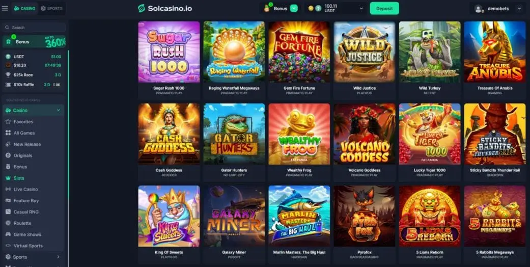 Despite styling itself as the ultimate Web3 Solana-based crypto casino, in truth, the vast majority of games at Solcasino.io are the same slots from the same providers you’ll see at most online casinos. For example, at the time of reviewing, the top slots were Sugar Rush 1000, Raging Waterfall Megaways, and Gem Fire Fortune by Pragmatic Play, Wild Justice from Platipus, Wild Turkey from NetEnt, and Treasure of Anubis from BGaming.