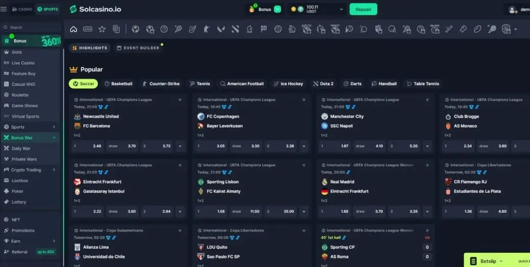 In common with all the best online crypto gambling platforms, Solcasino.io also boasts an extensive sportsbook. It offers standard and live sports betting on everything from soccer and basketball to ice hockey and handball.