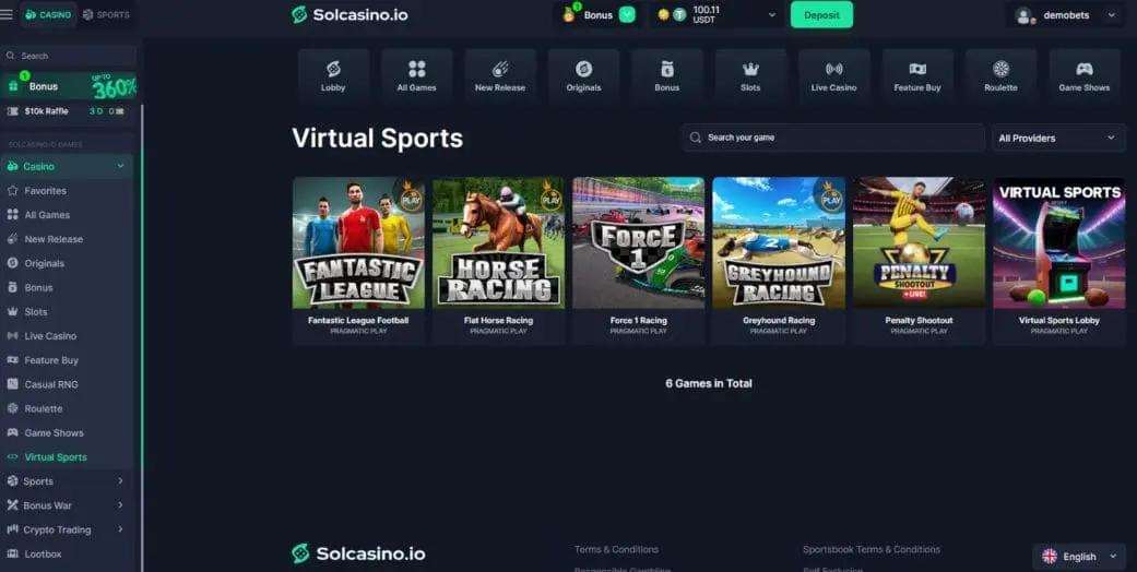 For those who like the idea of sports betting but prefer instant action, Solcasino offers a range of virtual sports from Pragmatic Play. Available options include Fantastic League Football, Flat Horse Racing, Force 1 Racing, Greyhound Racing, and Penalty Shootout.