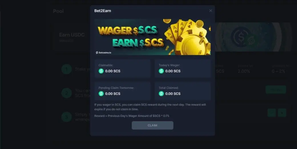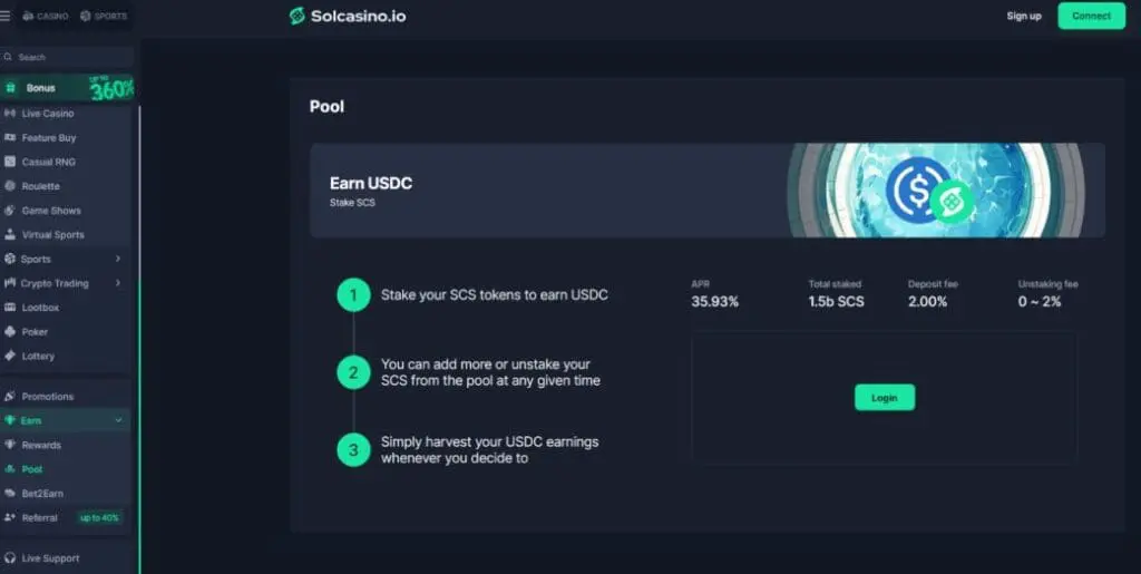 In terms of utility, using SCS to wager at Solcasino earns players rewards, while staking SCS in the casino’s liquidity pool can generate a passive income paid in USDC. At the time of writing this Solcasino.io review, the staking APR was 35.93%, with a 2% deposit fee and up to 2% unstaking fee, and a total of 1.5bn SCS were staked.