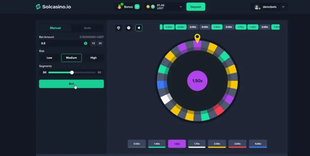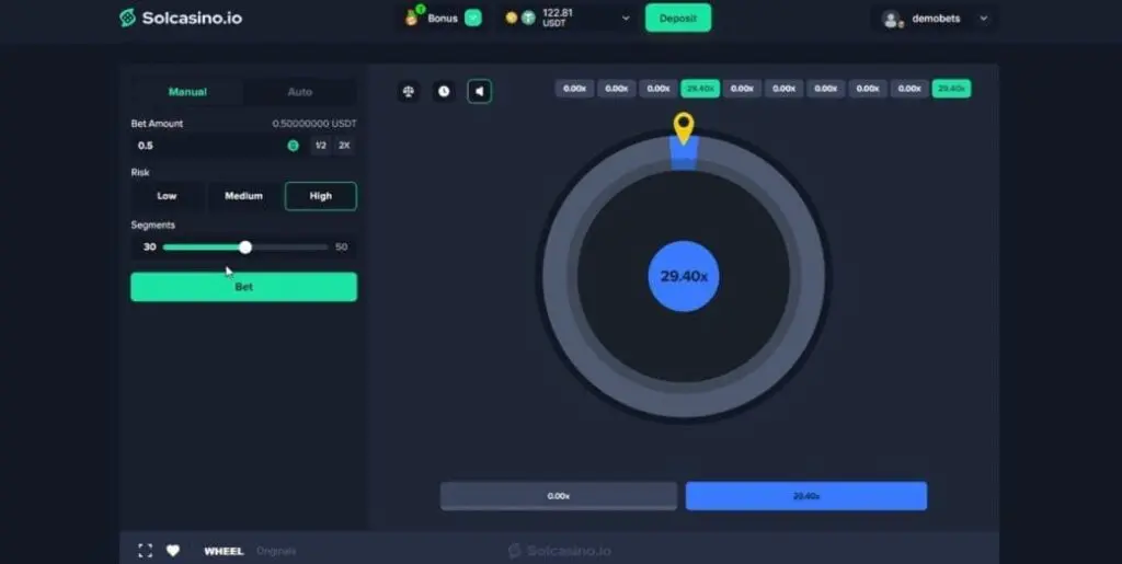 For today’s CoinBets Challenge, I decided to play on one of the Solcasino provably fair originals – specifically, Wheel. Now, regarding the game itself, there’s not much to say – it’s identical to virtually every provably fair wheel game. You set your bet, set your risk, and set the number of segments, then it’s time to spin.