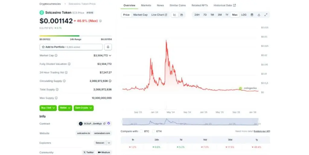 Solcasino Token (SCS) is the creatively named native token of Solcasino.io.