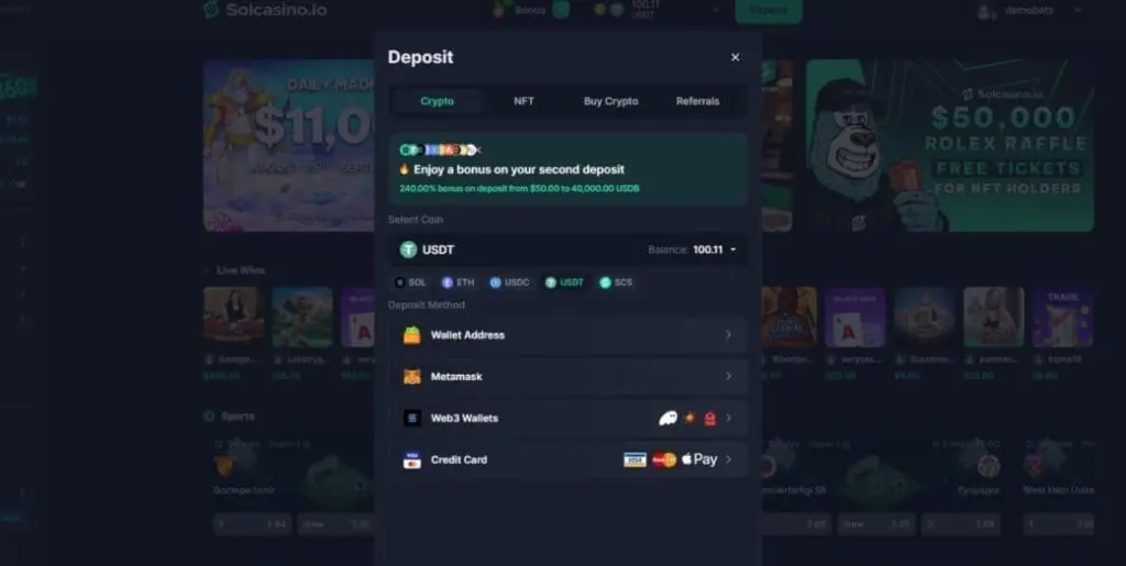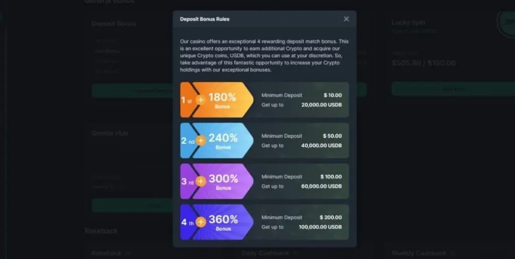 At the time of writing, the Solcasino.io welcome package consisted of bonuses spread over your first 4 deposits as follows:
