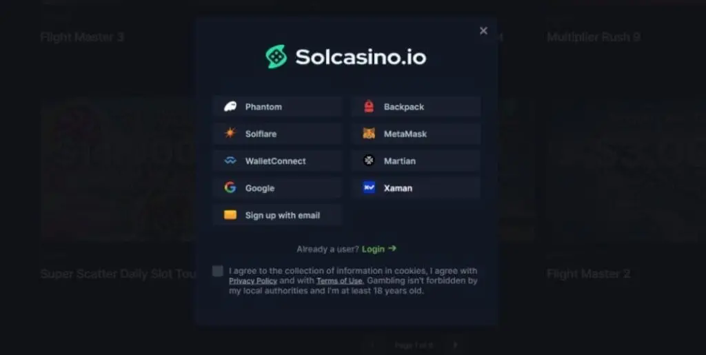 Setting up your new player account with Solcasino.io is incredibly quick and easy, with multiple options available. First, check the box to agree to the Cookie Policy, Privacy Policy, and Terms of Use, then do one of the following: