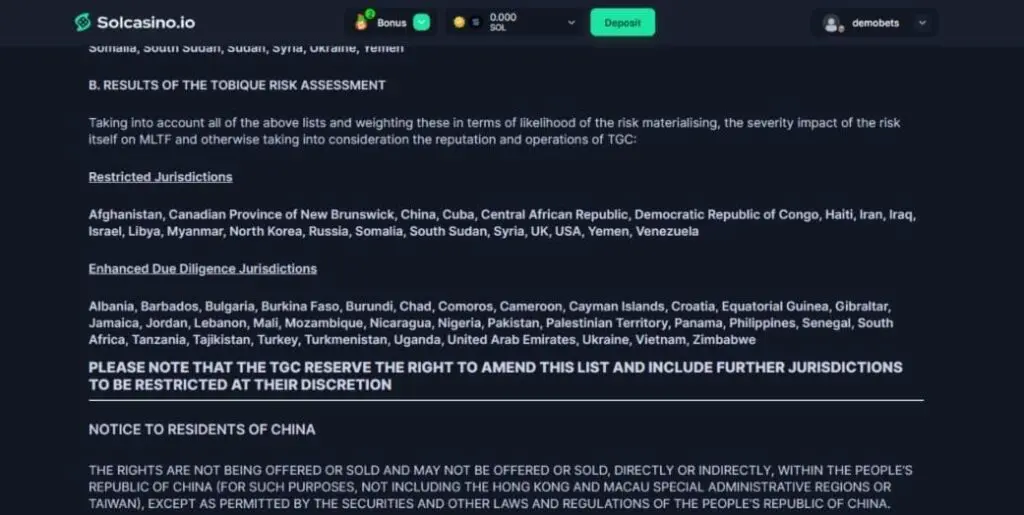 The Tobique online gambling license requires Solcasino.io to prohibit players from many jurisdictions, including major markets like the UK and the USA. It also requires the casino operator to carry out enhanced due diligence checks on players from many other jurisdictions, including countries like South Africa and the UAE. To its credit, Solcasino does provide extensive information about this in the Terms and Conditions.