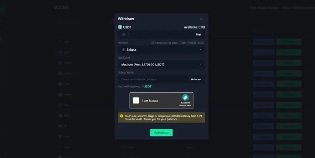 To withdraw crypto, open your wallet (in your profile menu), then find the balance you want to withdraw from and tap the blue “Withdraw” tab. Enter the amount of crypto you want to transfer, select the network and gas level if applicable, and then paste in your destination wallet address. If everything looks good, complete the hCaptcha and hit “Withdraw.”