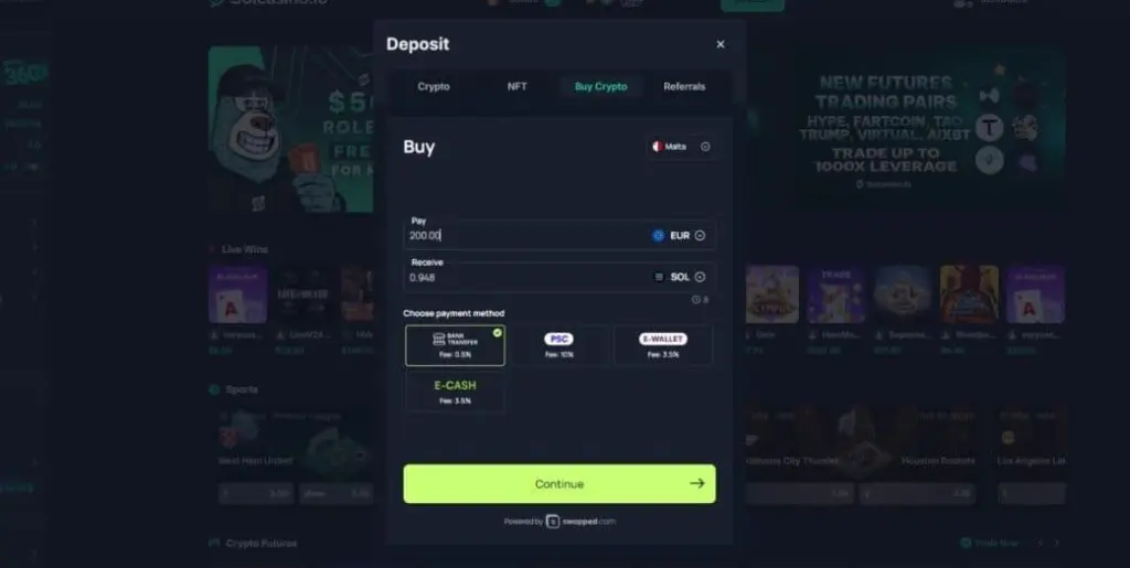 Like most of the best crypto casinos, Solcasino allows you to purchase crypto directly using fiat methods, including bank transfers, PSC, E-Wallets, and E-Cash. The service is powered by Swapped.com, and to do it, simply tap “Deposit” then “Buy Crypto”, and follow the prompts.