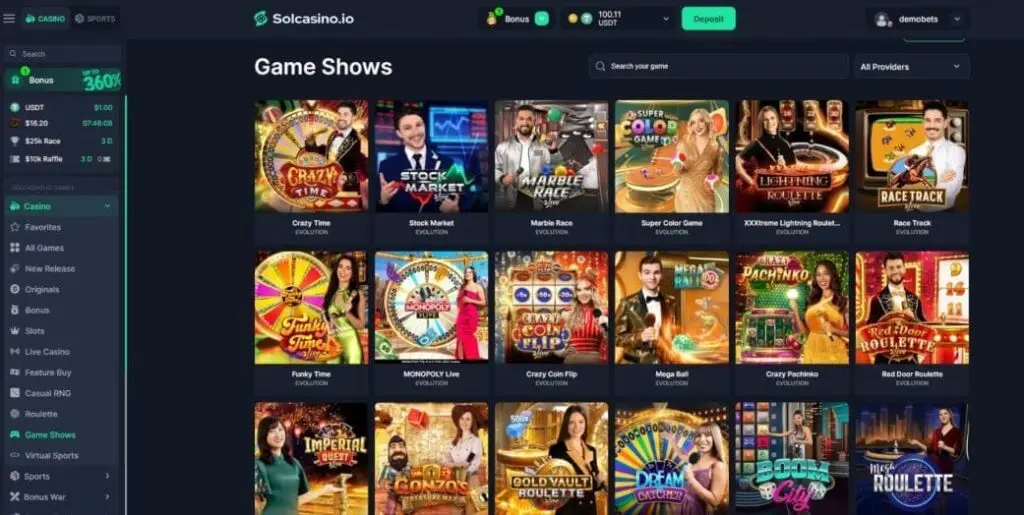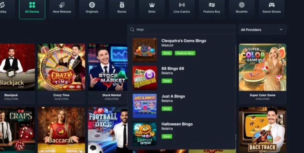 Thankfully, there is a live game show category, which makes browsing much easier. And, thanks to the presence of both Evolution and Pragmatic, the most popular game shows are available, including Crazy Time, Stock Market, Monopoly Live, XXXtreme Lightning Roulette, and Sweet Bonanza Candyland.