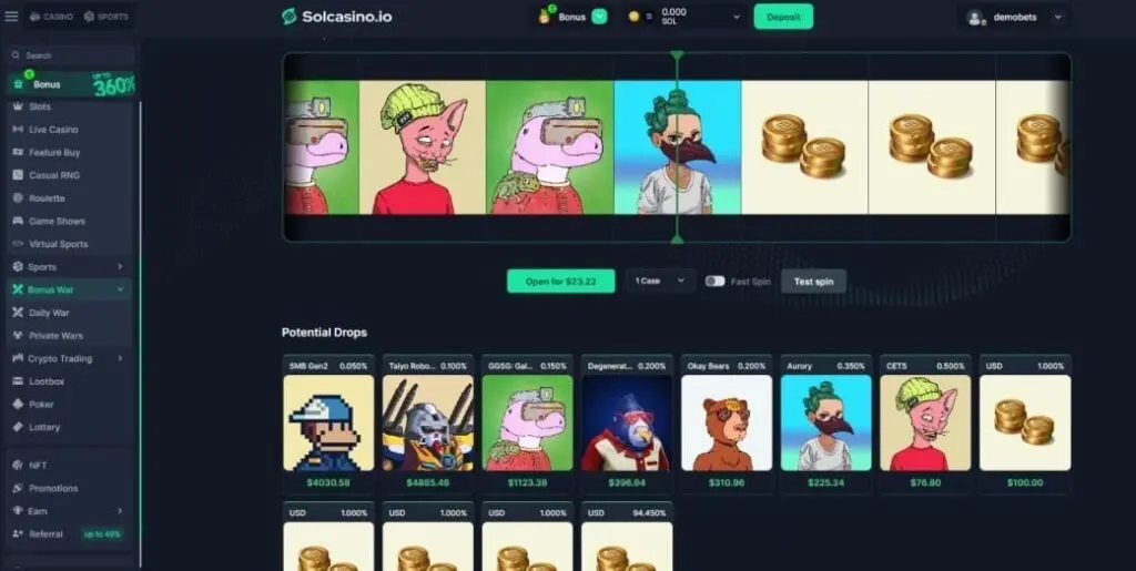 Cash and NFT lootboxes are also available to purchase. At the time of writing this Solcasino review, options included Counter-Strike cases, Bluechip NFT boxes, and Solana boxes. Prices ranged from US $2.61 to $277.67.