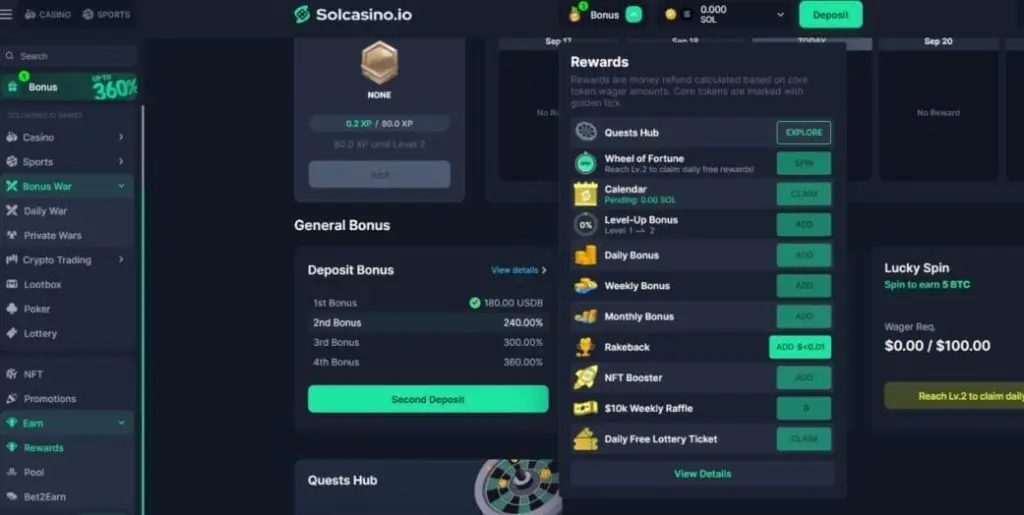 The Solcasino.io loyalty program spans an insane 80 levels. Perks include a daily bonus, weekly bonus, monthly bonus, rakeback, level-up bonus, NFT booster, referral reward, and NFT reward.