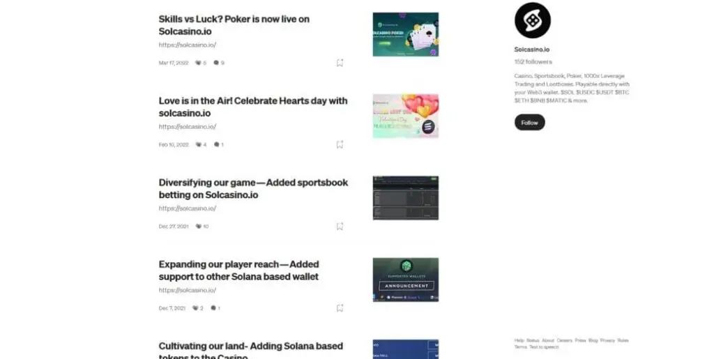 Unusually, there doesn’t seem to be a FAQ section or any other informational resources on-site. However, you can connect with and follow Solcasino on social media platforms like X (Twitter), Discord, and Telegram, plus there’s an official Medium with some useful articles and guides.