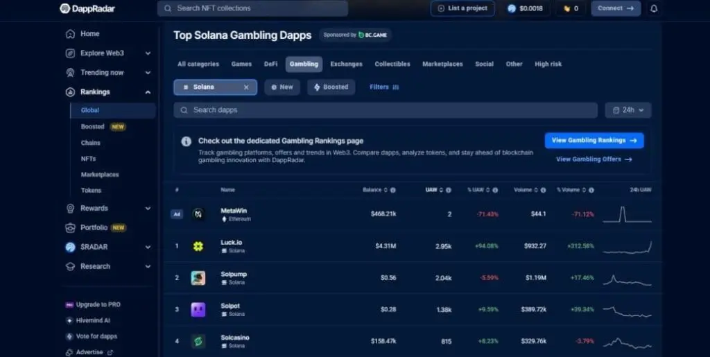 According to the Solcasino.io white paper, it was the first casino platform built on the Solana blockchain, and is among the top 5 most popular Solana dApps according to “Dapparadar”. I think they mean “DappRadar,” and that really should be “top 5 most popular Solana gambling dApps.” But yep, at the time of making this Solcasino review, the platform was at number 4.