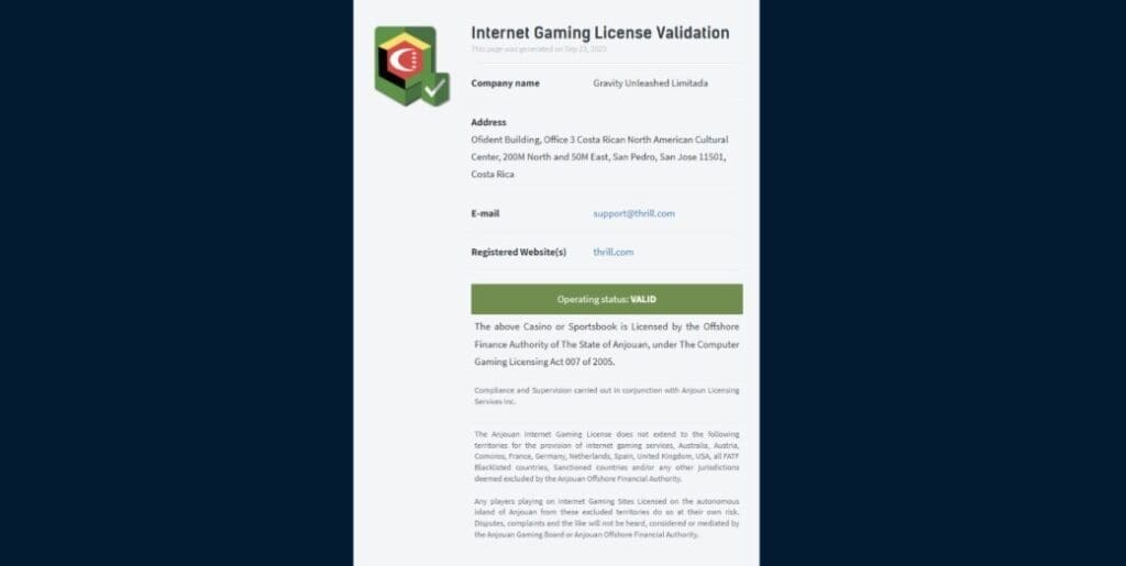 Curious how Thrill performs on trust and fairness? Below is a breakdown of the unique factors we considered when calculating its CoinBets Safety Index. This rating is based on objective criteria including licensing, player reports, game fairness, and operational transparency. Our goal is to inform players with verified data, not to promote or recommend any casino.