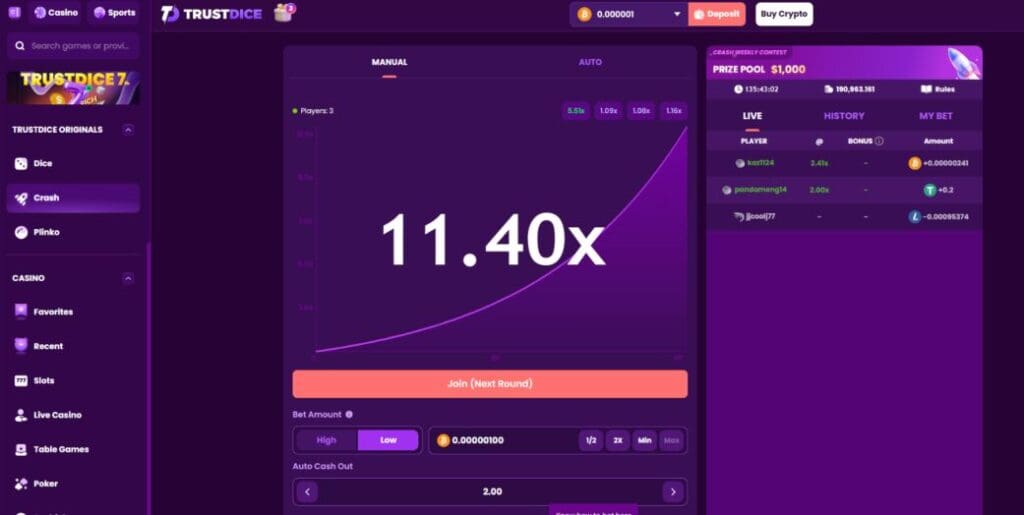 After my dismal wins on the Lucky Seven and Fire Lightning slots, I needed to rescue my bankroll, which was standing at just 66.9205 USDT. So, for Trust Dice’s CoinBets Challenge, I settled in for the long haul and decided to see if I could play it safe all the way up past 100 USDT again. To do this, I chose the Trust Dice original provably fair crash game, Crash (imaginative!).