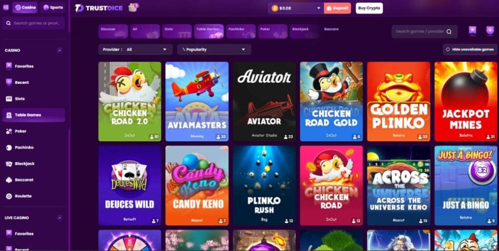 Trust Dice offers over 8,000 casino games from 35 providers. Overall, the games are logically organized, though some more filters would be useful. However, as is often the case, depending on where you are located, many games/providers may be blocked, significantly reducing your options.