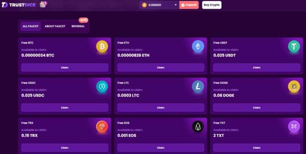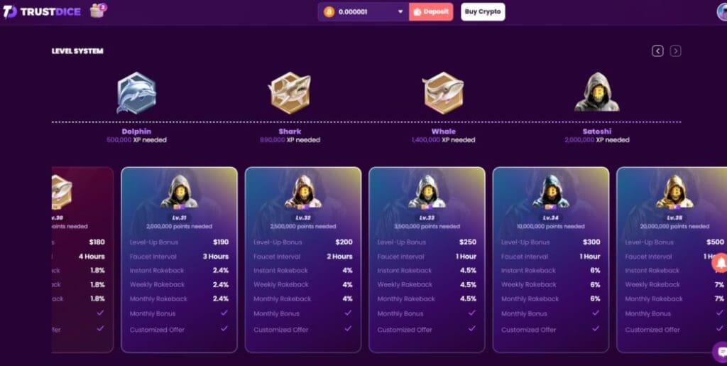 For some reason, Trust Dice’s loyalty and VIP program is sea creature-themed. Despite this, it’s all pretty standard stuff – you’ll earn points for betting real crypto and money, and gradually level up through the various tiers (sorry, “Satoshi levels”), earning better perks as you go. You’ll also get access to a crypto faucet dispensing free BTC, ETH, USDT, USDC, LTC, DOGE, TRX, EOS, and TXT.