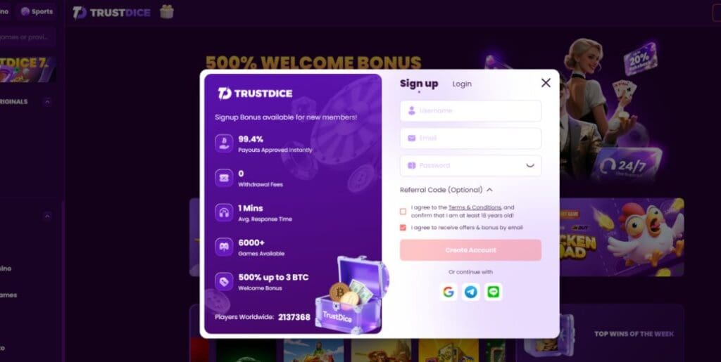 Getting your new account up and running at TrustDice is quick and easy, with two options available. Unfortunately, however, there’s no way to connect a Web3 crypto wallet.