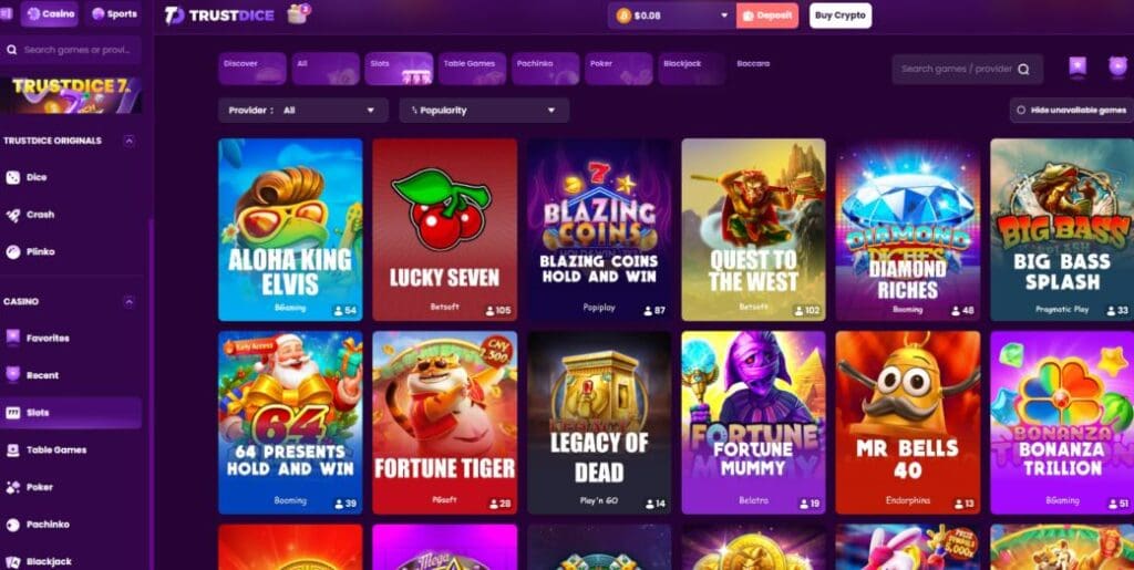 The bulk of the games catalog at Trust Dice consists of slots. Of course, you’ll find recent titles like Sweet Bonanza 1000 from Pragmatic Play, Elvis Frog in Vegas by BGaming, Life and Death by Hacksaw, and Candy Blast by Push Gaming.