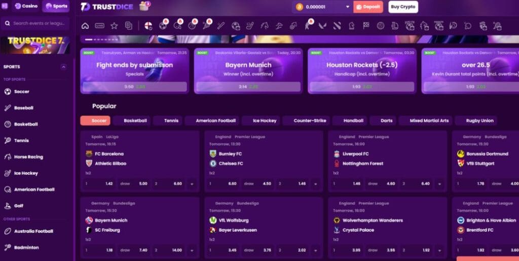 In common with most of today’s crypto gambling platforms, Trust Dice offers a sportsbook alongside its casino. Standard and live betting is available on a host of traditional sports, including soccer, baseball, basketball, tennis, MMA, boxing, ice hockey, and American football.