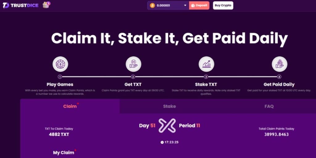 TXT is the native crypto token of TrustDice. It’s based on the EOS blockchain and facilitates tokenomics, including exclusive rewards and staking.