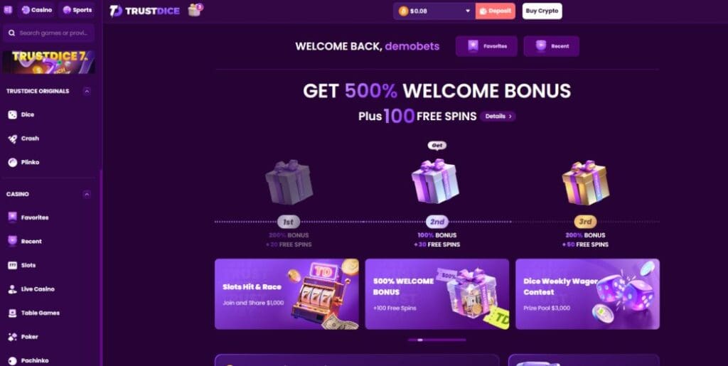 Launched in 2018, Trust Dice is a Curaçao-licensed crypto casino that proudly proclaims itself the “#1 crypto gambling platform on TrustPilot”. Today, it offers over 6,000 slots, instant wins, table, live dealer, and provably fair games, alongside sports and esports betting.