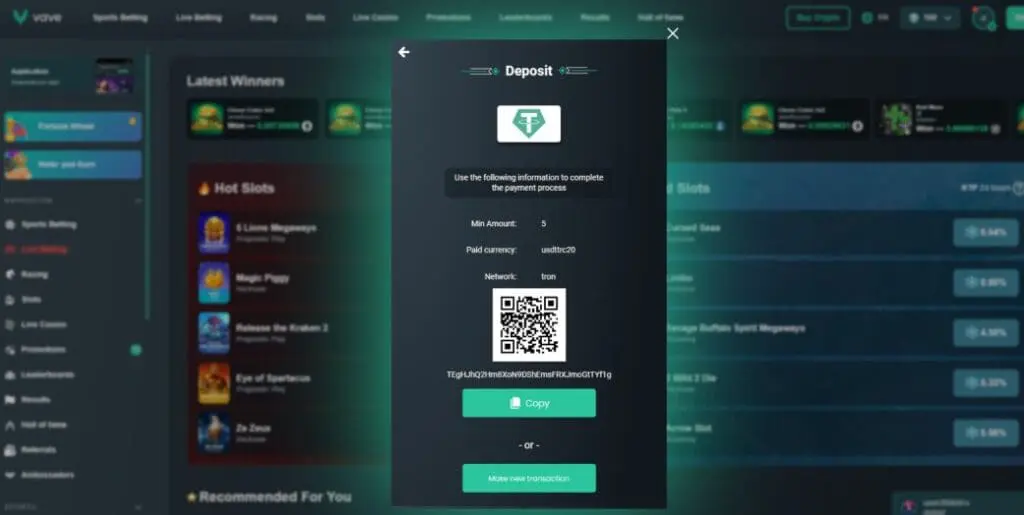 To make a crypto deposit, navigate to “Cashier”, then select “Deposit.” Choose your crypto and network (if applicable). You will be provided with a unique crypto wallet deposit address in both text and QR code formats.