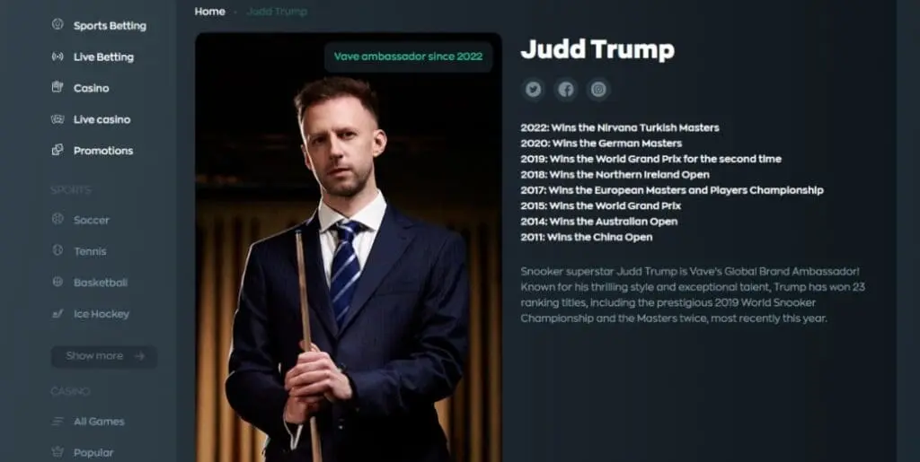 At the time of writing this Vave review, the platform’s Global Brand Ambassador was British professional snooker player Judd Trump.