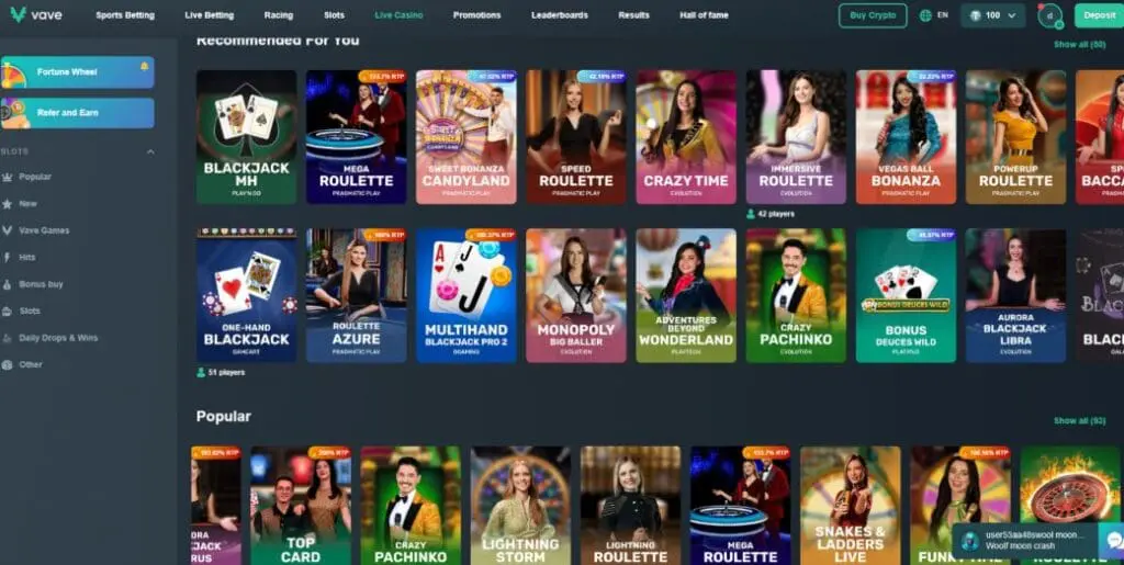 Live game show fans will also be happy here, with Vave offering no fewer than 58 to choose from. Options include hit like Sweet Bonanza Candyland and Mega Wheel from Pragmatic, Lighting Storm and Crazy Time from Evolution, and Top Card and Cabaret Roulette from Winfinity.