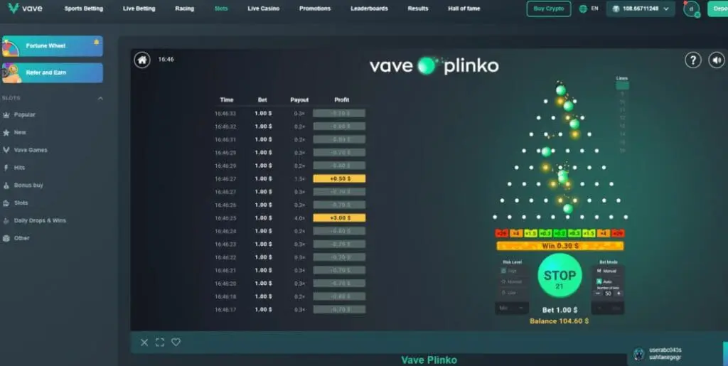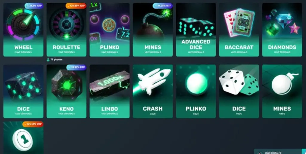 In addition to provably fair games from third-party providers like Spribe and InOut, Vave also offers a range of original in-house games. Specifically, there’s Wheel, Roulette, Plinko, Mines, Advanced Dice, Baccarat, Diamonds, Dice, Keno, Limbo, Crash, Plinko, and Coins.