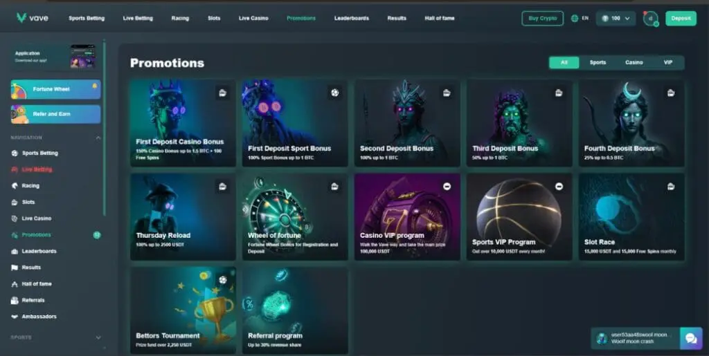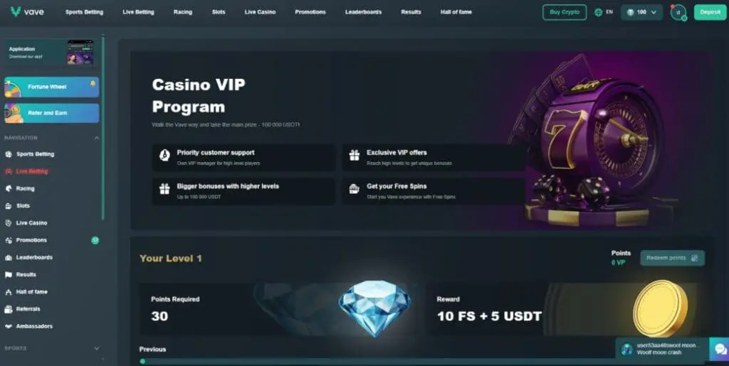 Wheel of Fortune – Deposit at least 100 USDT to get a silver spin, or 500 USDT to get a gold spin on the Vave Fortune Wheel.