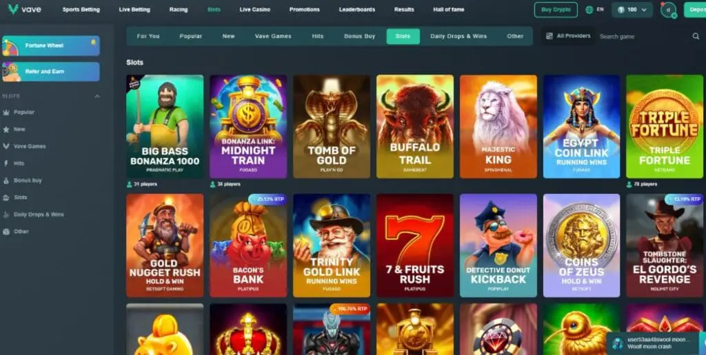 Vave offers more than 9,000 casino games from almost 130 providers — which is undeniably impressive. The lobby is reasonably well organized, with some helpful categories, like Bonus Buy, New, and Daily Drops & Wins – but it could really use some granular filters.