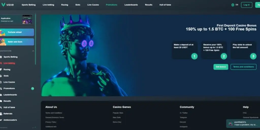 Complementing the Vave casino is a sportsbook offering standard and live betting on a wide range of sports. All the mainstream sports are available, including football, basketball, tennis, snooker, and cricket. Additionally, there’s a dedicated racing section for horses, harness, and greyhounds.