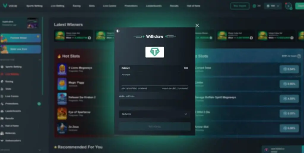 Signing up with Vave casino is simple enough, but the only option is to use your email. You can’t log in with third parties like Google, Steam, or Discord, and there’s no support for Web3 wallets like MetaMask or Phantom.
