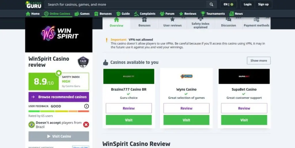Assessing any online casino’s real reputation is incredibly difficult due to fake reviews and biased affiliate marketing platforms. Still, out of interest, here’s a snapshot of WinSpirit casino’s ratings on several popular review sites at the time of writing: