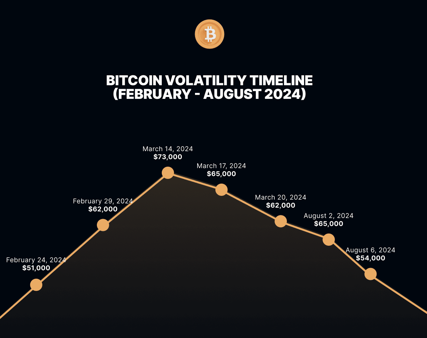 • On August 2, 2024, BTC was priced at just over $65,000 but had dropped to under $54,000 by August 6.