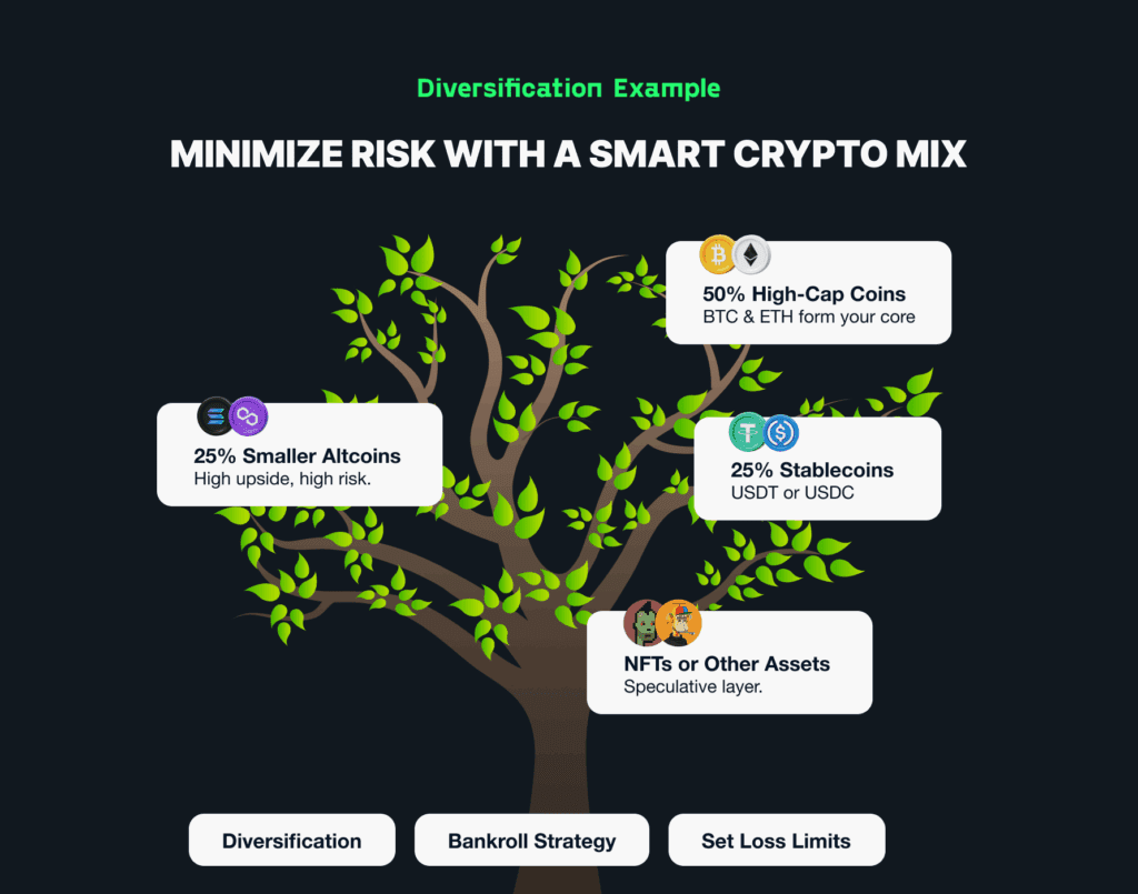 In practice, a well-diversified crypto portfolio could look something like this: 50% in high-cap coins like BTC and ETH, 35% in smaller altcoins like SOL and ADA, and 15% in memecoins like PEPE and SHIB.