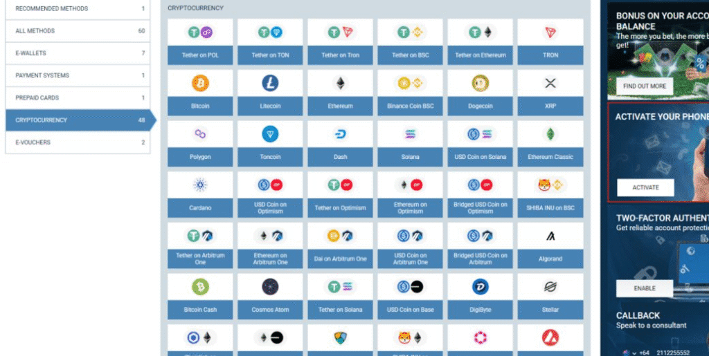 Surprisingly considering its size, 1XBET.com doesn’t provide the option of buying crypto directly from third-parties like MoonPay or Changelly.