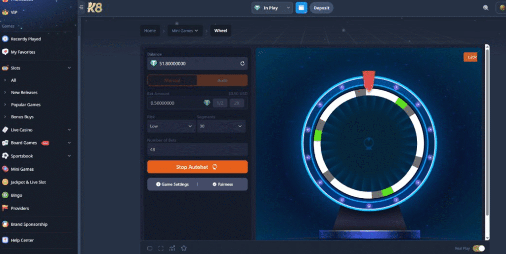 K8 crypto casino claims to offer more than 5,000 casino games from almost 60 providers. The main lobby is reasonably well organized, with separate categories for slots, live casino, board games, mini games, bonus buys, jackpot & live slots, and bingo. You can also toggle the RTP to show on thumbnails, which is a nice touch.