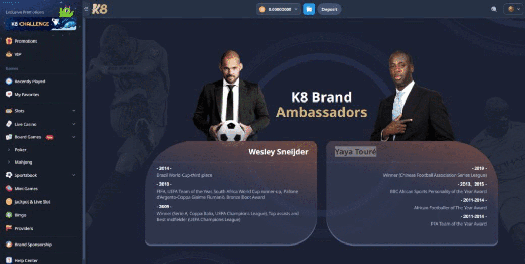 K8 also sponsors German football club Schalke 04, Italian club Cagliari Calcio, the Philippines national team, and the Maldives national team. The brand also has a couple of individual brand ambassadors, in the form of Wesley Sneijder and Yaya Touré.