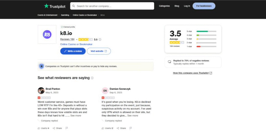 Sooo, that’s what K8.io has to offer, but what do players think of it? Well, as always, I’ll preface this by saying it’s very hard to gauge a casino’s reputation these days – there are just too many fake reviews and too much affiliate spam out there. But out of interest, here’s how a few popular review platforms rated K8 casino: