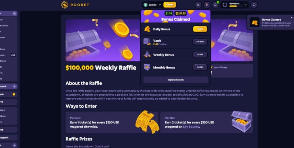 Unusually for a large crypto casino, Roobet doesn’t offer a specific welcome bonus.