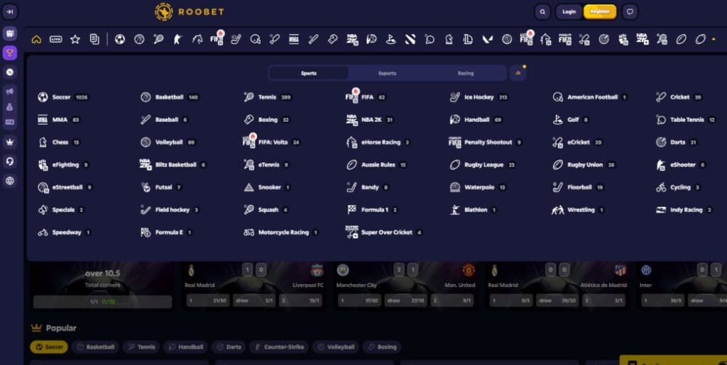 While this Roobet review is casino-focused, it’s worth mentioning the site has a fully loaded sportsbook. Competitive odds are offered on live and pre-game betting across all mainstream sports, including soccer, basketball, tennis, horse racing, handball, darts, volleyball, and boxing. Esports betting is also offered for disciplines including FIFA, NBA 2K, Counter-Strike, and Dota 2.